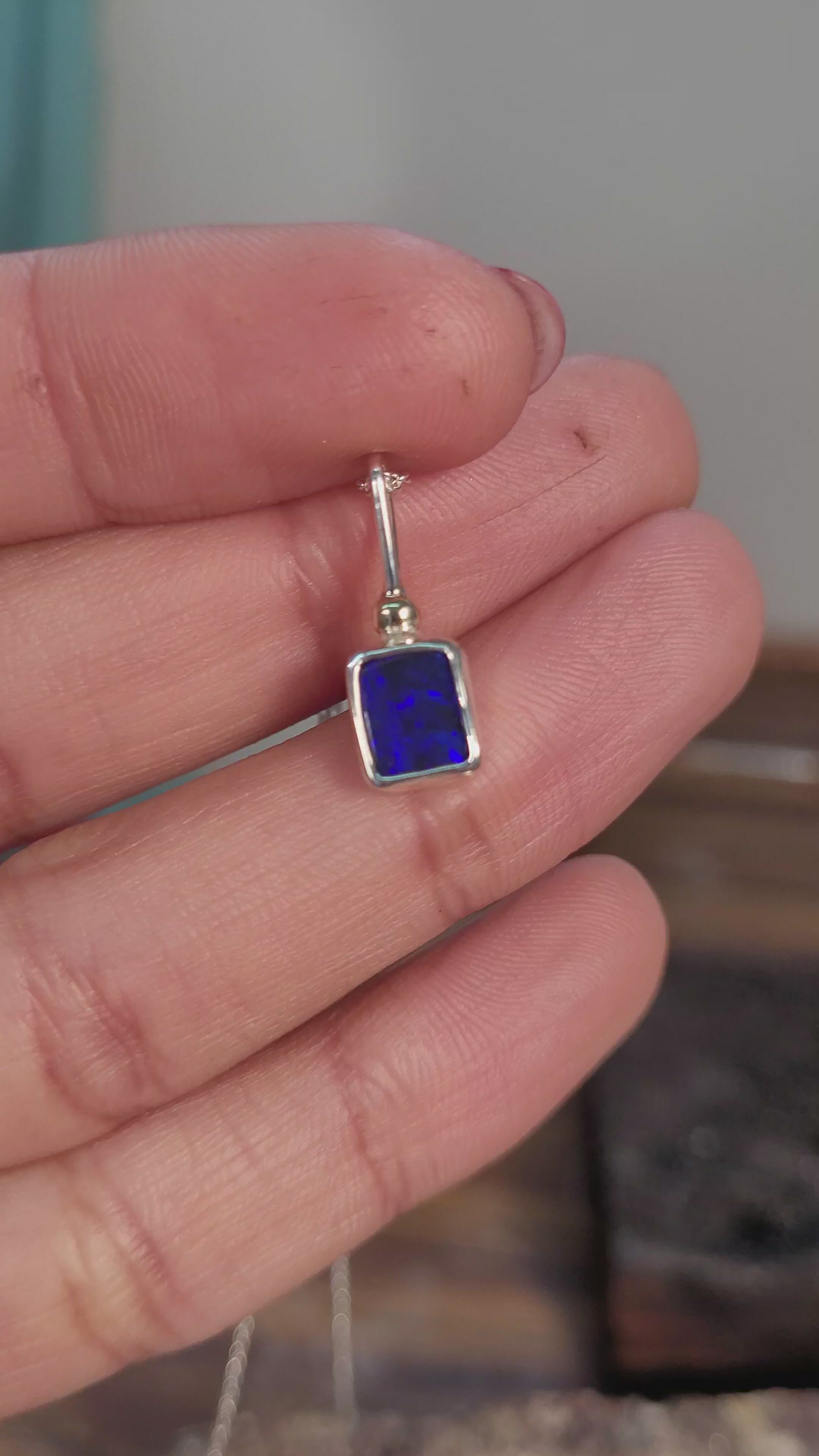 Colgante artesanal elaborado con doblete de ópalo australiano, bolita de oro de 14k y plata sostenible.